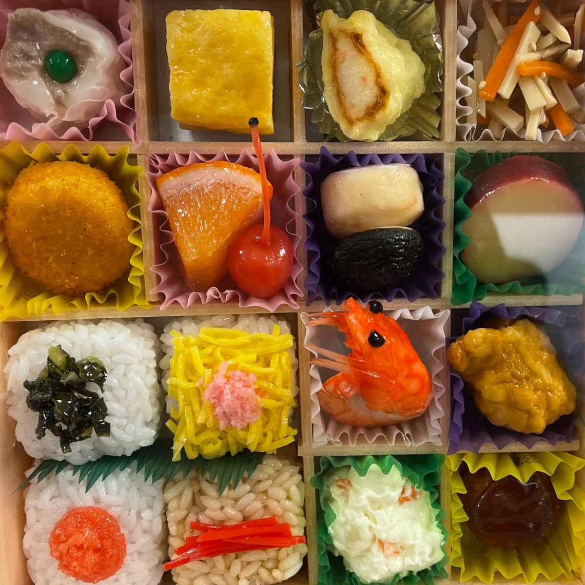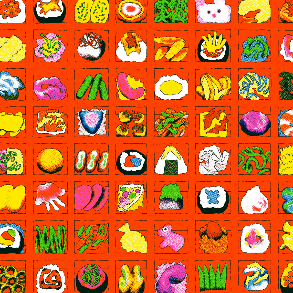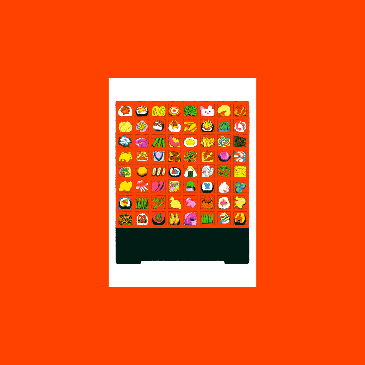 The excitement of opening a bento box with an assortment of little bites in different shapes, color, texture, species, and origin printed as an A3 risograph poster.